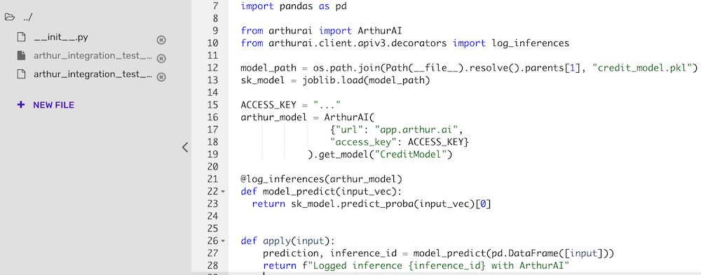 The last step here is that we’ll want to wrap our model’s predict_proba() method using the loginferences decorator provided in the arthurai library. To do this, we’ll define a simple function called **modelpredict()** for this wrapping, and we’ll decorate that method as shown below.