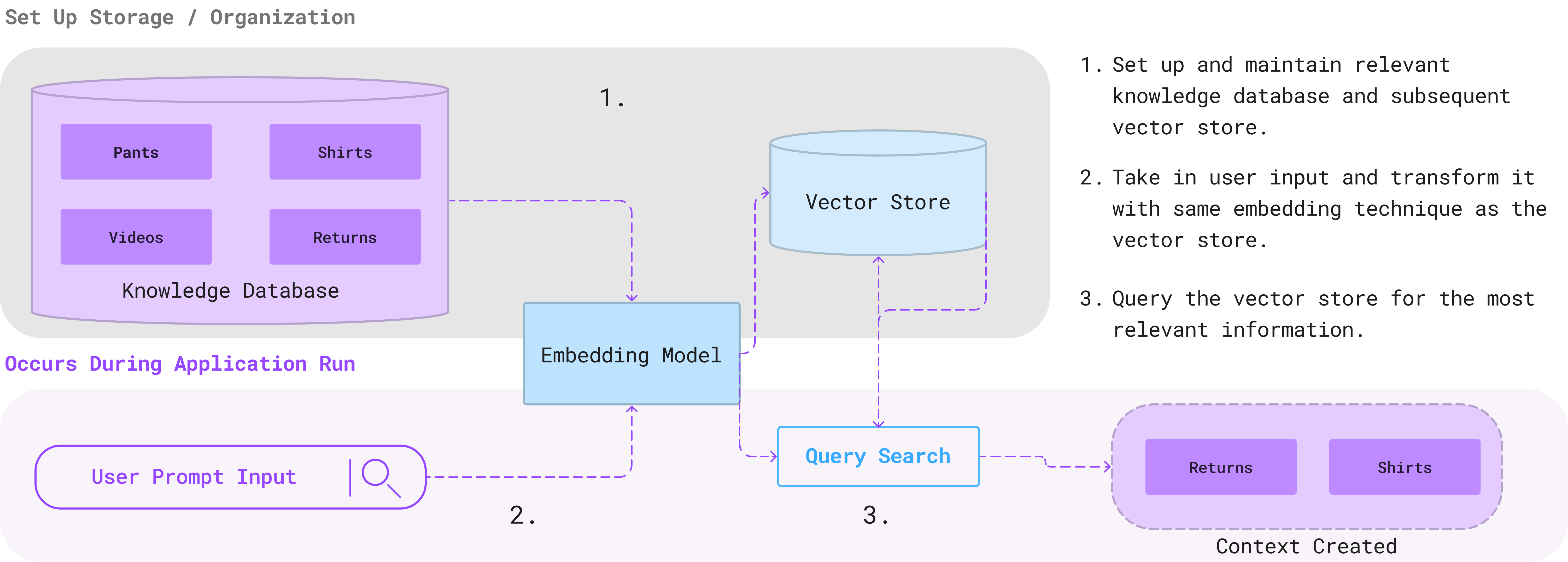 Query Functionality: A query search is done to find the most relevant documents similar to the embeddings of the user input prompt. This search functionality can be done with various techniques, from simple similarity measures to machine learning.