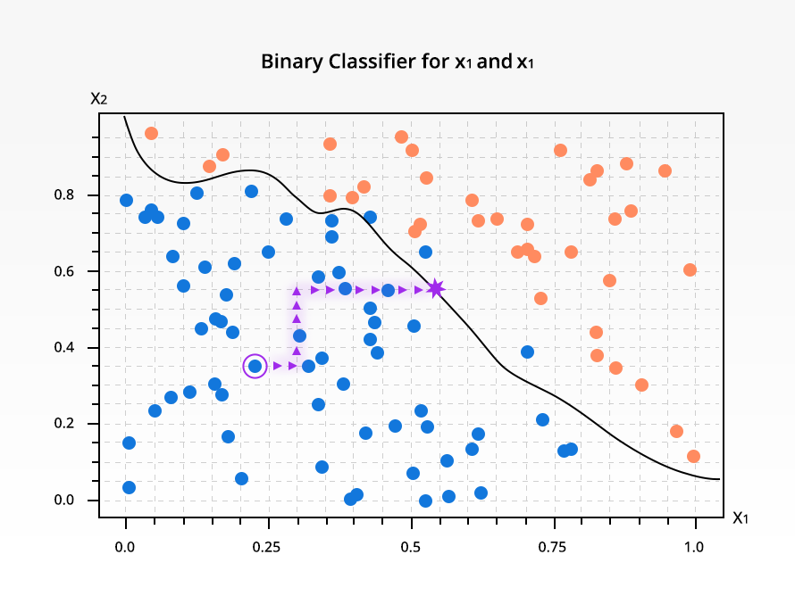 Our recent work (appearing soon at AAAI) shows how to use a reinforcement learning framework to generate real-time counterfactual explanations. Let us consider a very simple dataset: \(x_1, x_2, y\). We have some binary classifier that creates a decision boundary shown in Figure 1. Our goal is to move any arbitrary point on the left side of the boundary, namely points in blue, across the boundary to be classified as the opposite class (orange points).