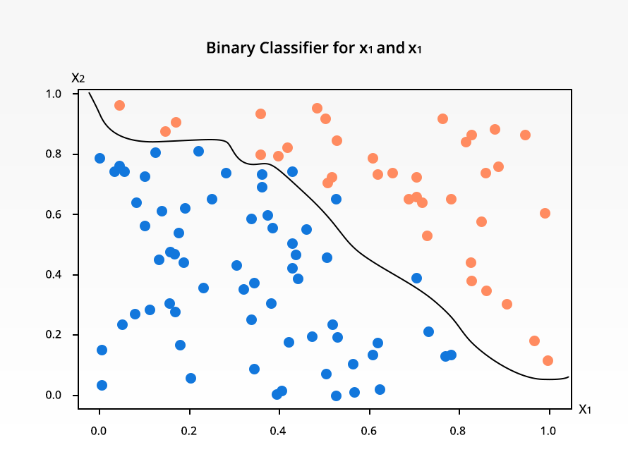 Figure 1: Decision Boundary for Arbitrary Dataset. Note the binary classifier is not perfect and mislabels a few points, namely the blue points on the right side of the graph.