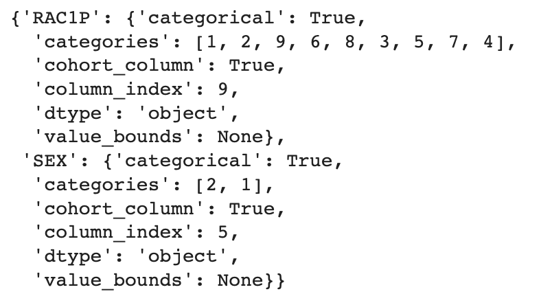 Prior to training my model, I defined each of the relevant groups of columns in my code. I also defined data bounds for numerical features, and which columns were to be used to track specific cohorts of interest within the dataset.