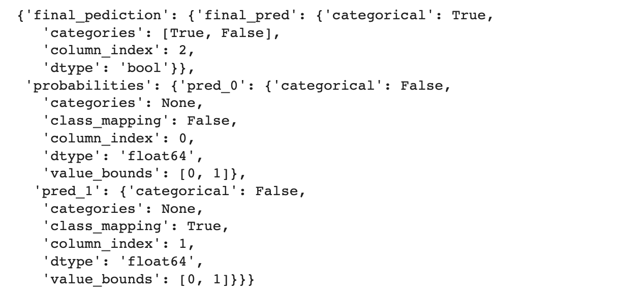 For model output columns, it is useful to include both raw model outputs and the final prediction made by the model. In addition to the fields outlined above, columns with raw model outputs may require a field to map raw outputs to the final model output. If the model is a multi-label model, it is also important to note which prediction task the column corresponds to.