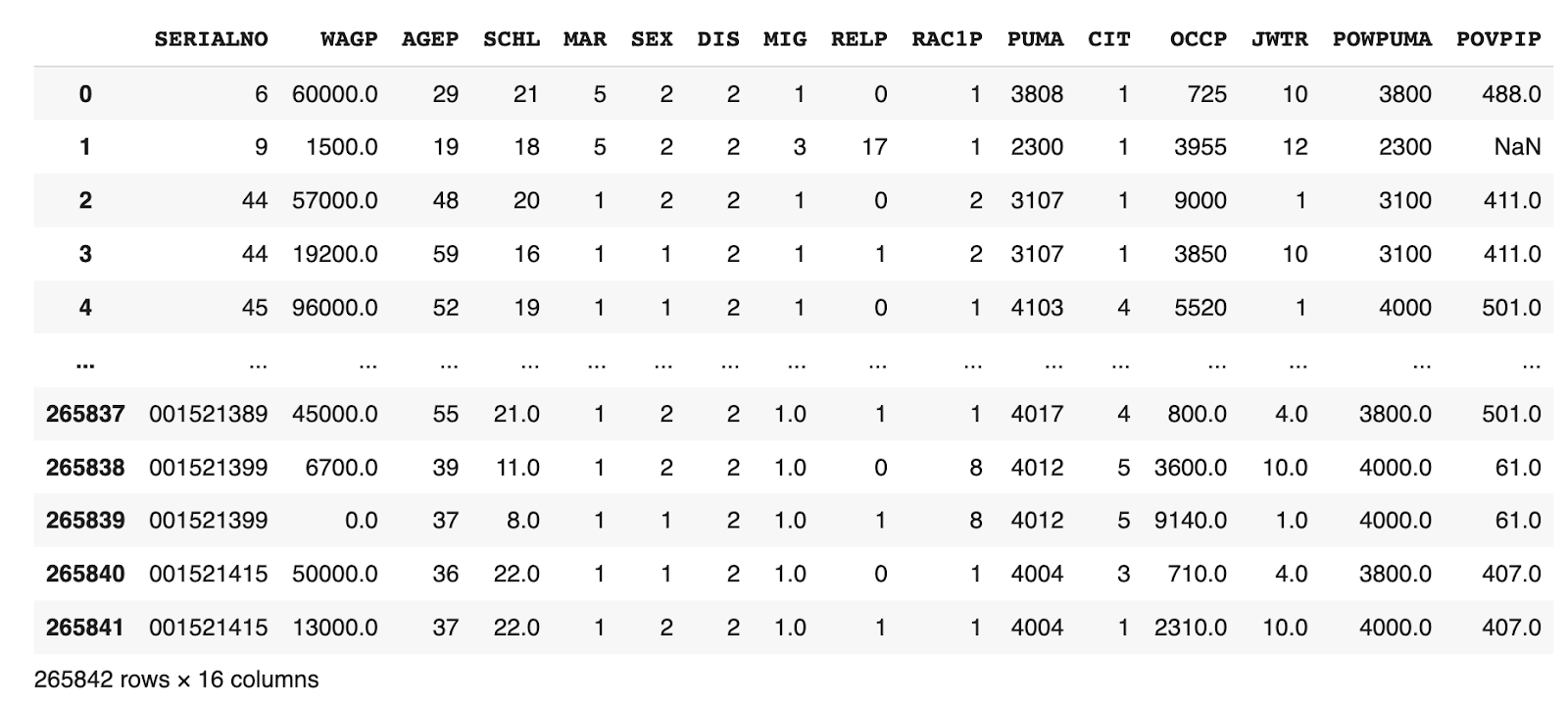 The features in this dataset were not all used as input to the model. SERIALNO was used only as an identifier and join key during data manipulation. RAC1P and SEX were not used as model input, but were important information to track nonetheless to evaluate model fairness concerns. The features also include a combination of numerical and categorical data.