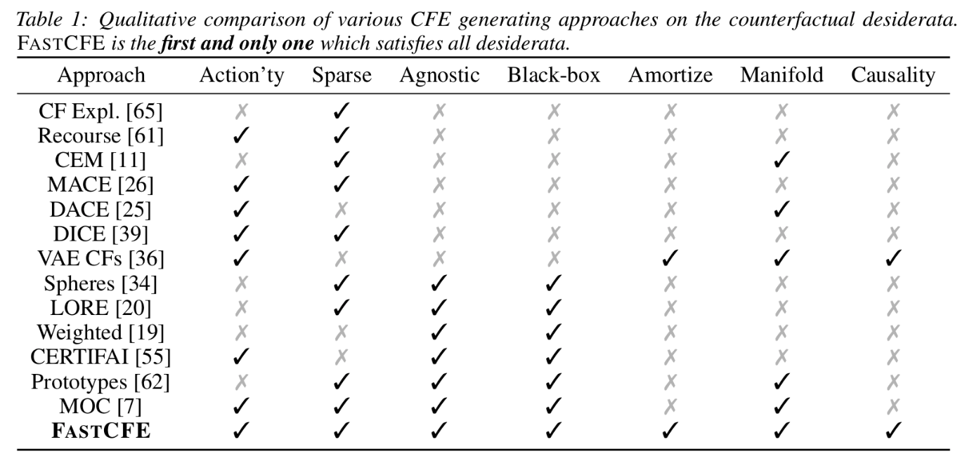 We’ve recently posted a new approach to these problems which allows us to solve for many of these constraints. By framing the problem of generating counterfactual explanations as a Markov Decision Problem, we can associate many of the desiderata to various components of an agent and environment (such as the transition function or reward function). Then, using common techniques from reinforcement learning, we can train an agent to calculate counterfactuals for a given model. Once this agent is trained, we have amortized the computation of new counterfactuals, since any new counterfactual is calculated by simply evaluating the agent’s policy for any starting point. This makes the method extremely computationally efficient for calculating new counterfactuals. As you can see in the table below, our approach, which we termed FastCFE, is able to accommodate all of the major desiderata/constraints that have been brought forth recently in the counterfactual explainability community. This is an exciting development in operationalizing counterfactual explainability for real-world and high-volume use cases. We hope you enjoy the paper.