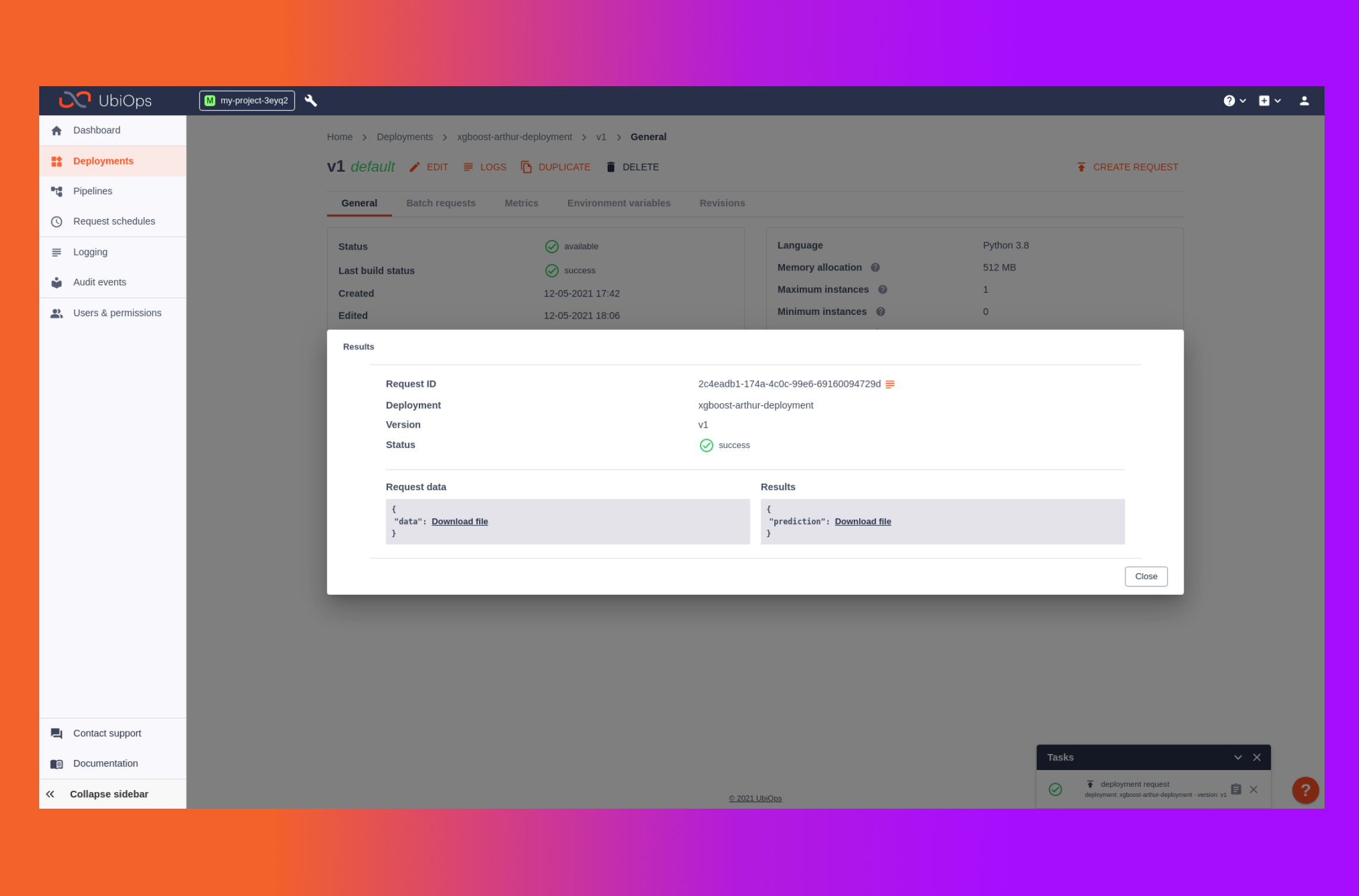 UbiOps is the easy-to-use serving and hosting layer for data science code. UbiOps makes it easier than ever to use a top-notch deployment, serving, and management layer on top of your preferred infrastructure. Accessible via the UI, client library, or CLI, it’s suitable for every type of data scientist, without the need for in-depth engineering knowledge.