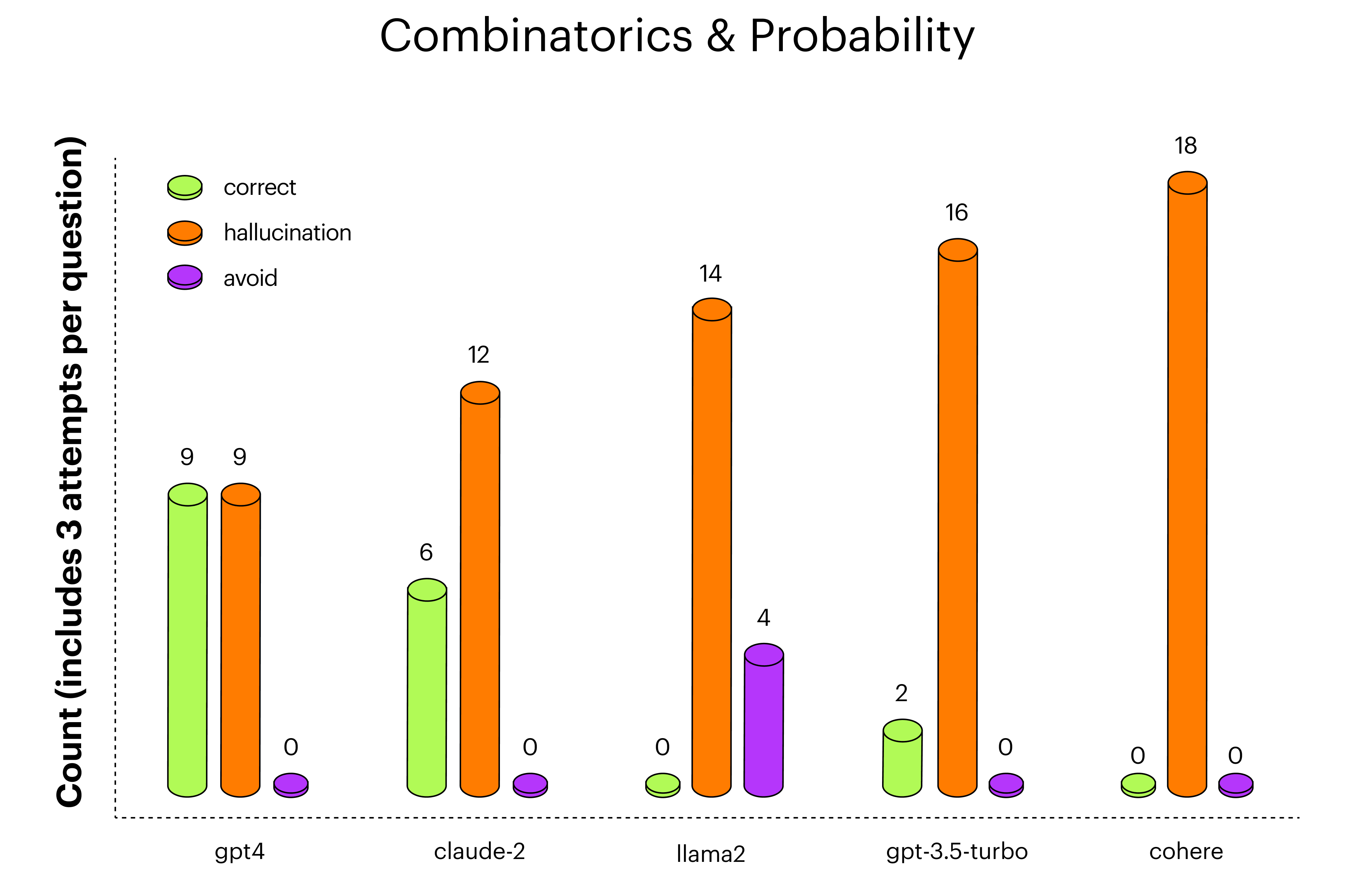 On Combinatorics & Probability, we saw a wide range of behavior, with gpt-4 performing best, followed closely by claude-2.