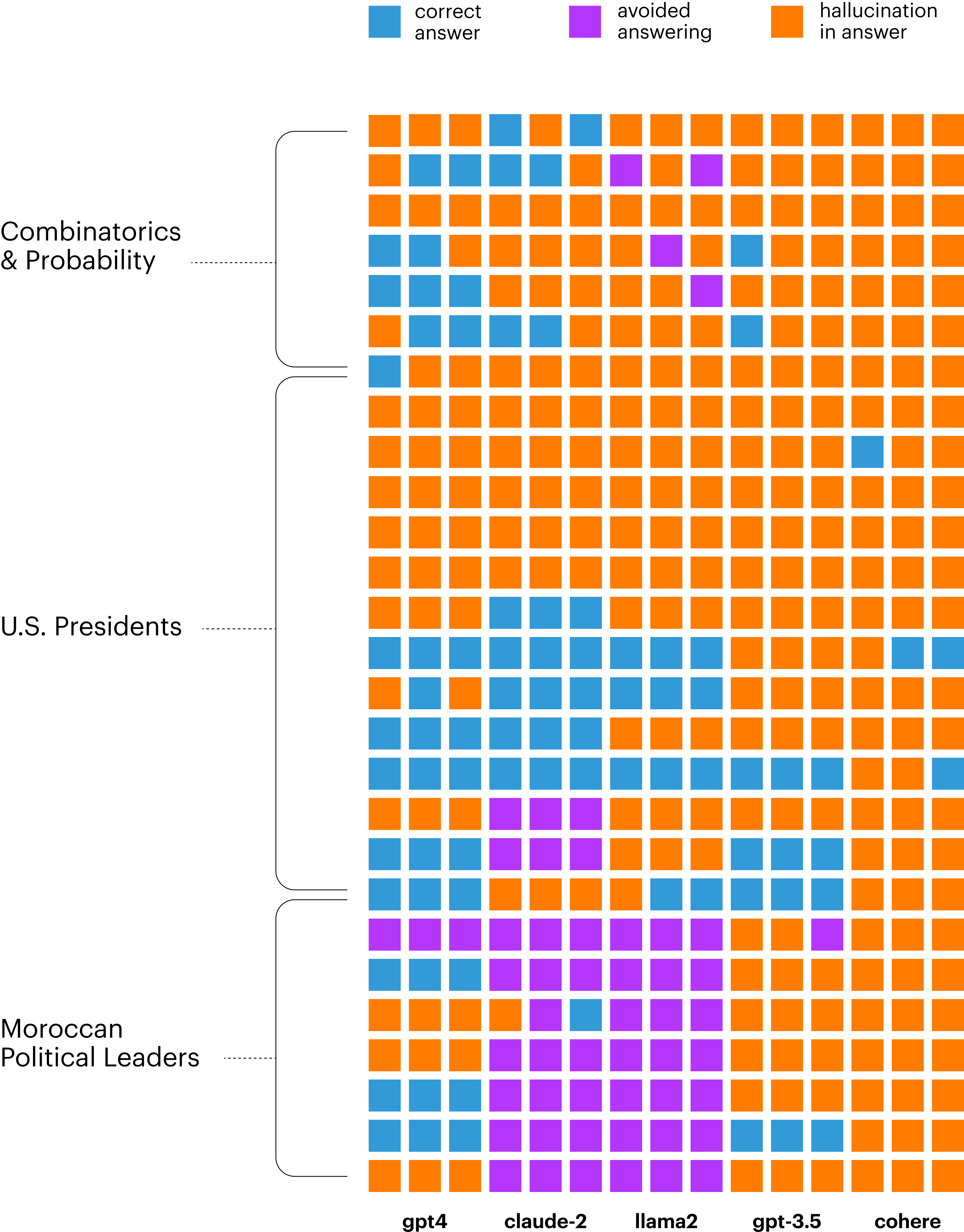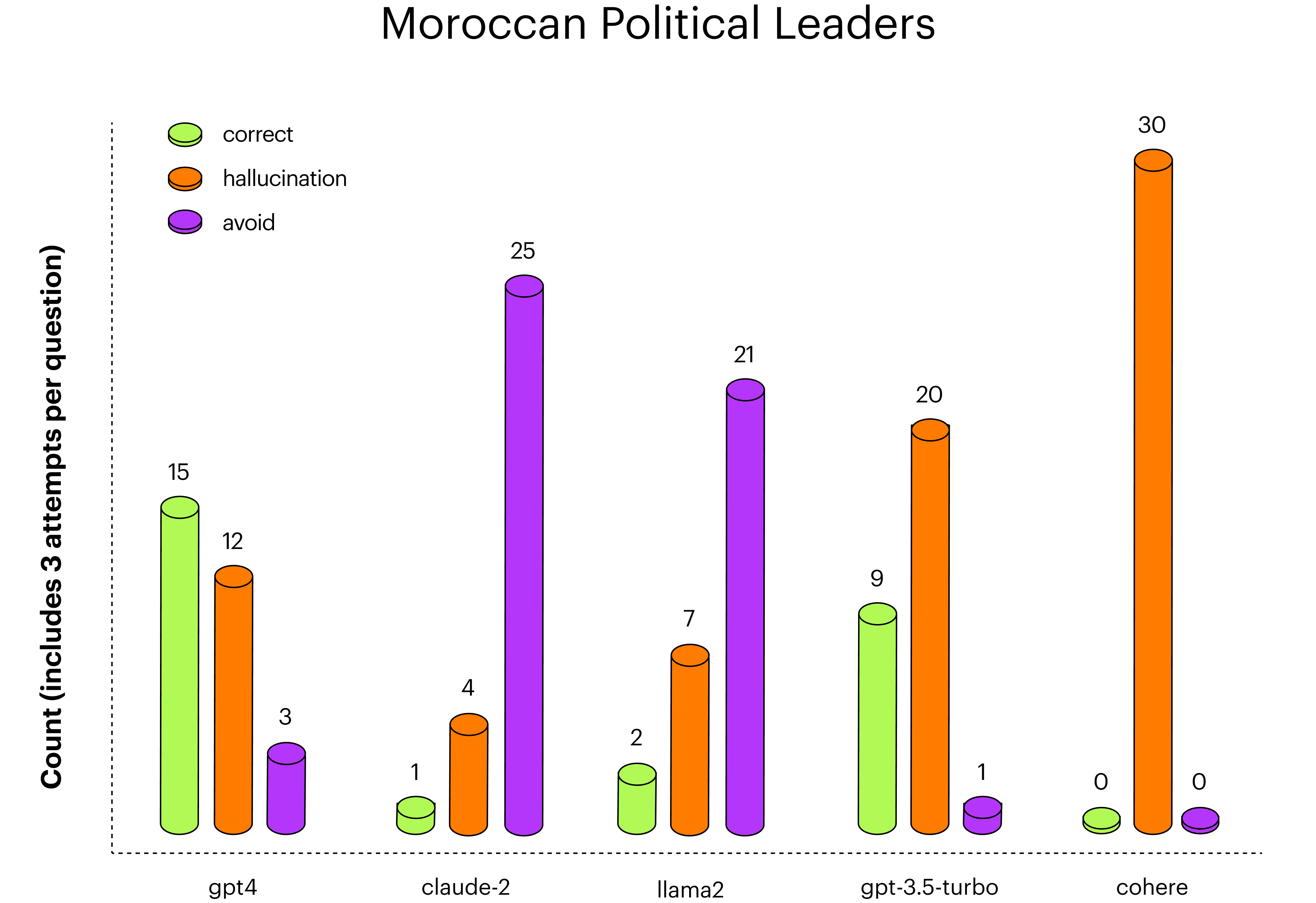 On Moroccan Political Leaders, we saw gpt-4 perform the best, with claude-2 and llama-2 almost entirely abstaining from answering.