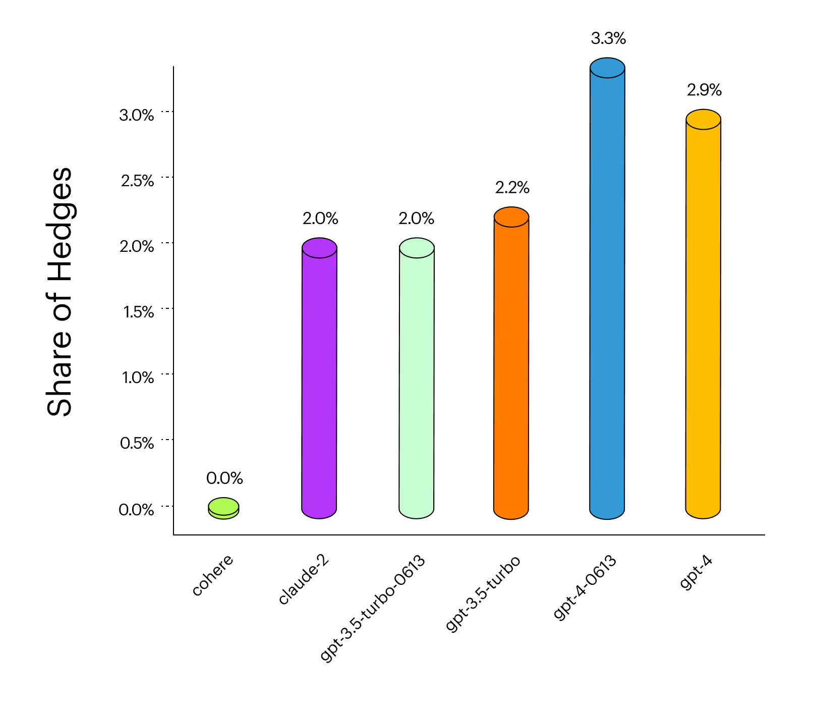 The reason Cohere's model shows significantly fewer hedging responses could be due to differences in training data, model architecture, or fine-tuning approaches. Each language model has its own unique training regime and data sources, which can lead to variations in their responses. For example, if Cohere’s model was trained on a dataset with more assertive language or was specifically fine-tuned to reduce uncertainty in its outputs, this could result in fewer hedged responses. Alternatively, the model might have been designed or adjusted to prioritize confidence in its answers, which would naturally lead to a reduction in hedging. However, without specific details from the developers, these are just educated guesses.